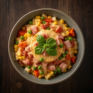 ماکارونی , خیارشور , فلفل دلمه , سبزیجات , ژامبون مرغ , مایونز , ادویه مخصوص